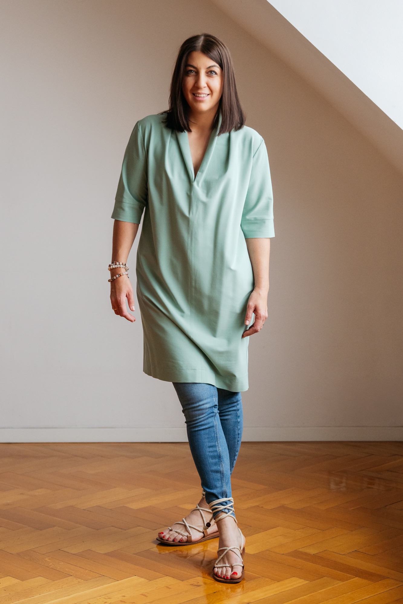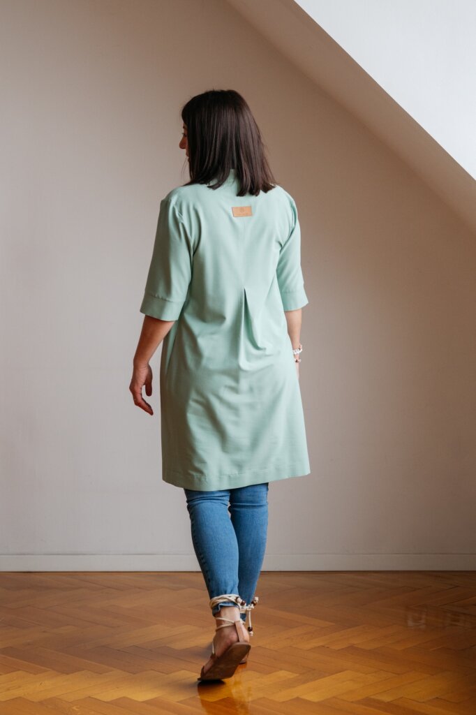 A mellvarrás helyett a vállon kialakított hajtások gondoskodnak arról, hogy nagyobb mell esetén is legyen elegendő hely, miközben a szabás a has tájékán is bőséget biztosít. Az oldalvonalak optikailag egyenesnek tűnnek, mégis egy finom, alig észrevehető ívvel rajzoltuk meg, hogy a test természetes formáit kövessék, és kényelmes viseletet adjanak.