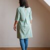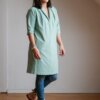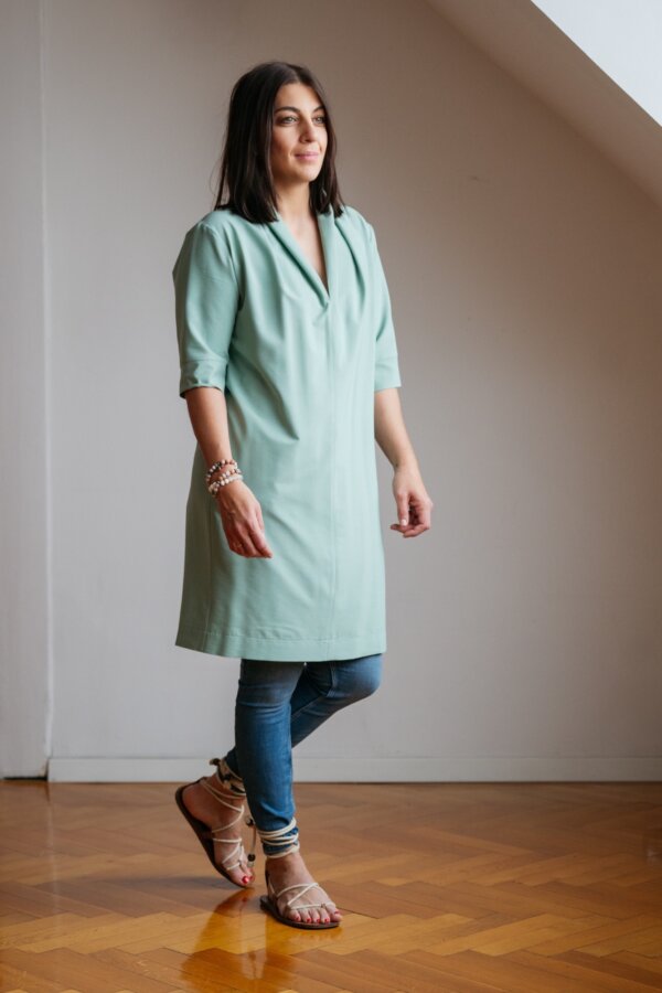 Ez a térdig érő ruha 95% viszkóz és 5% len keverékéből készült – természetes tapintású, légáteresztő, kényelmes viselet. Egyenes szabású, de a vállon és háton elhelyezett szembe hajtások extra kényelmet és bőséget adnak, így a ruha nem tapad rá a testre, mégis szépen követi annak vonalait.