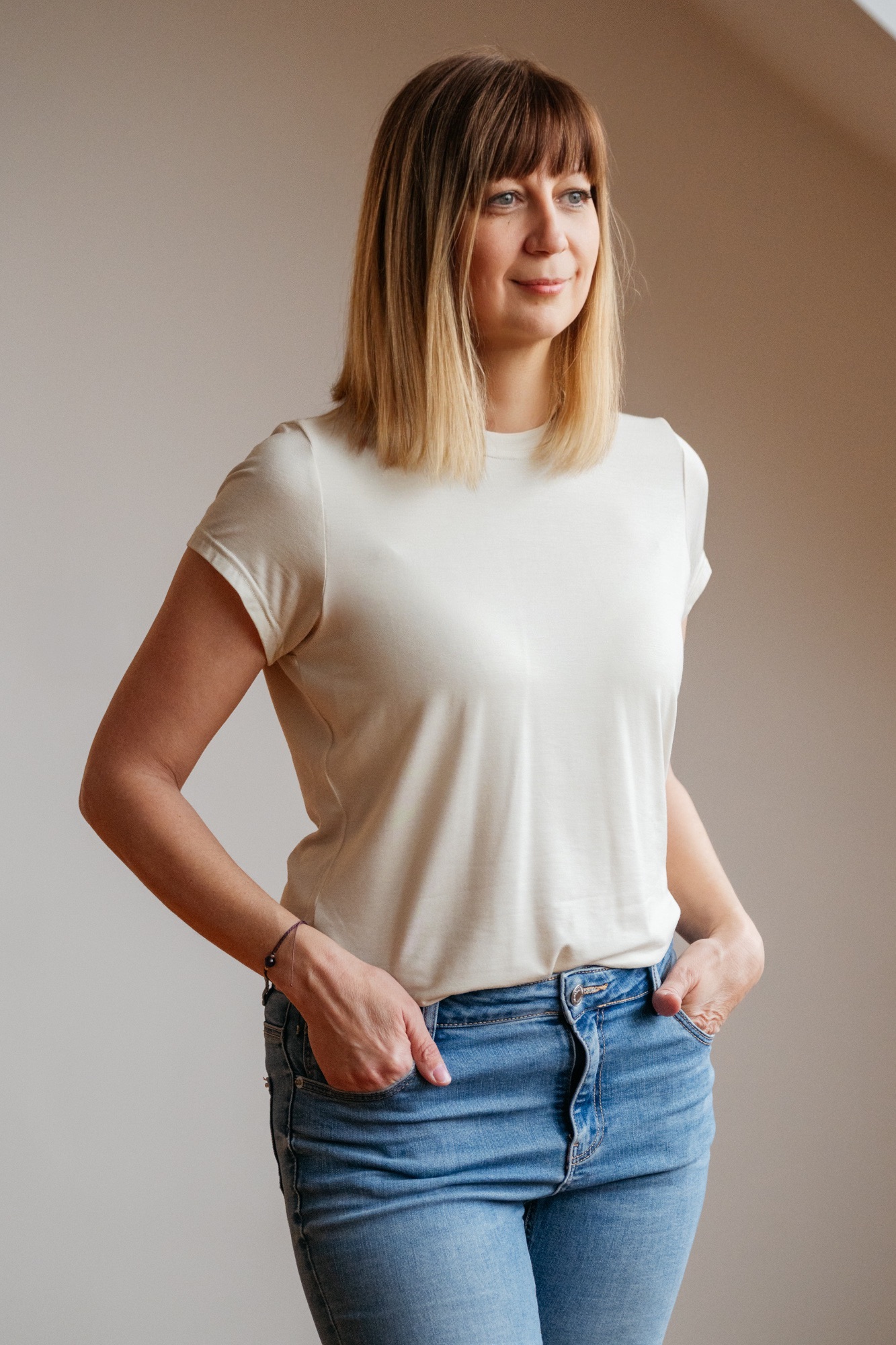 A modell meleg tavasz színtípusba tartozik, 170 cm magas és s/m méretet visel.