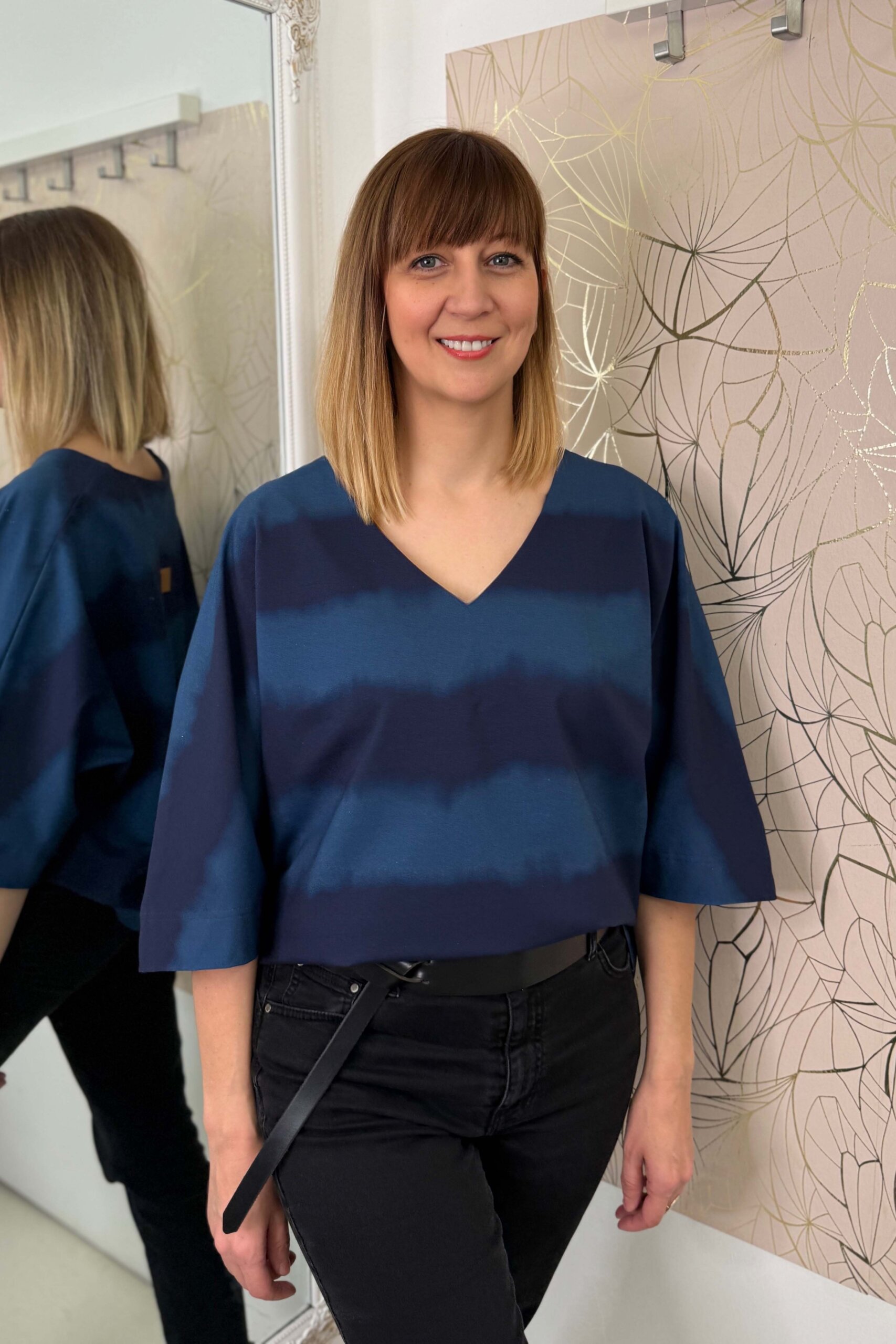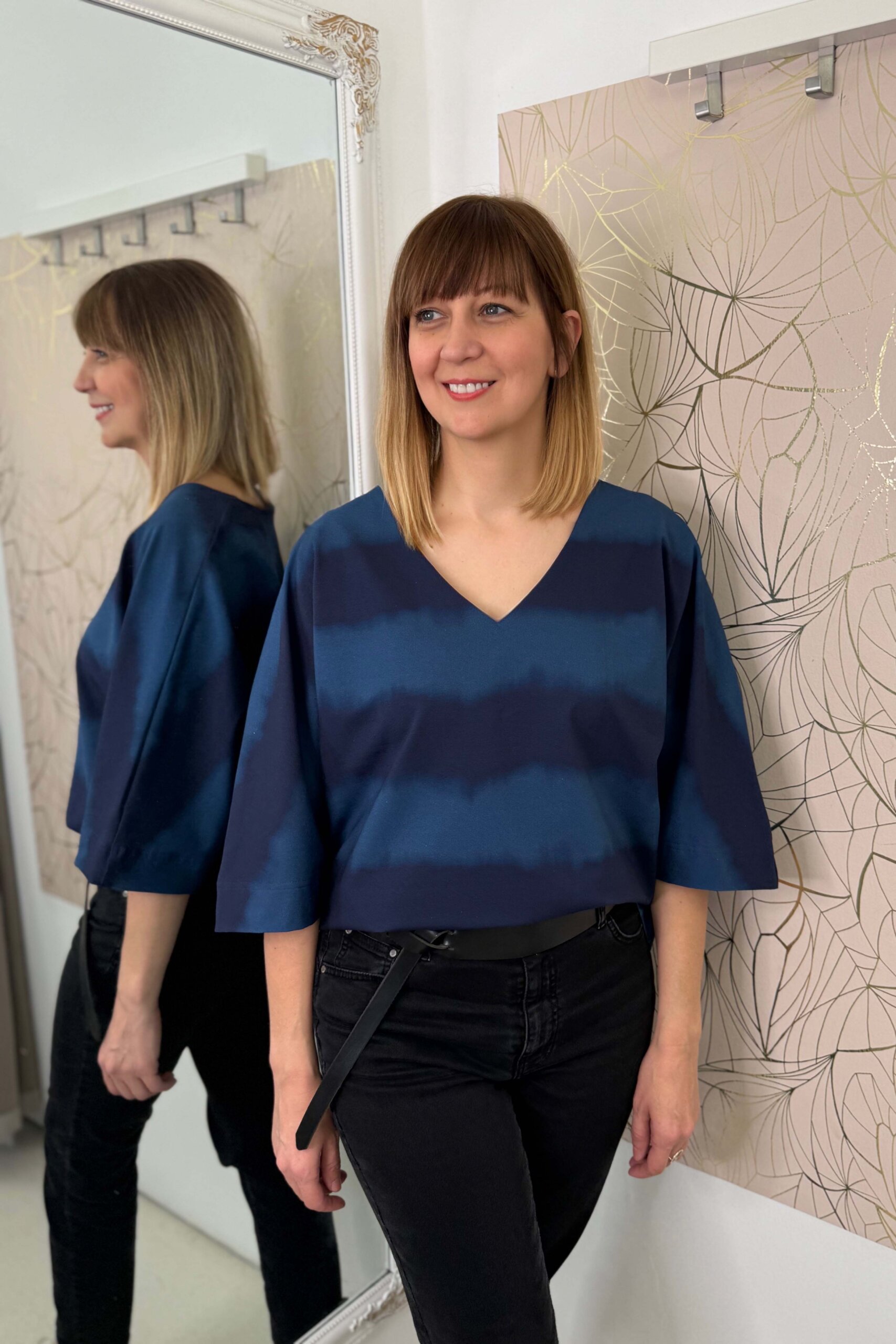 Farmerrel lazán betűrve, övvel hangsúlyozva vagy kiengedve is jól működik – sportos és nőies irányba is könnyen formálható.