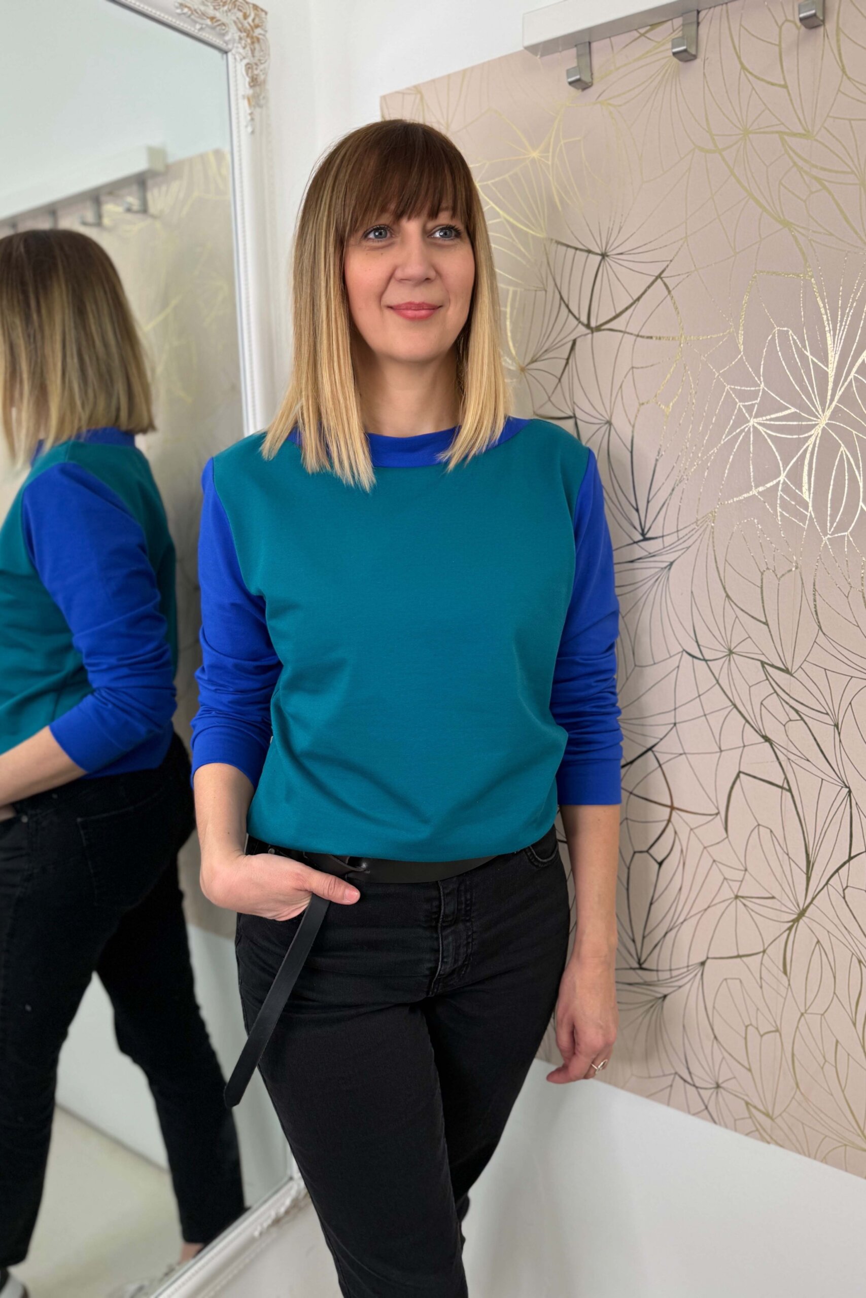 Ez a rövid állású, csónak nyakú, hosszú ujjú felső a hétköznapi kényelem és praktikum tökéletes kombinációja. Hátán vegán bőr címkével díszített, amely az Art on Me védjegyének számít, és egyedi megjelenést kölcsönöz a felsőnek. Ideális választás mindennapi viseletre, amely egyszerre kényelmes és fenntartható organikus pamutból készült.