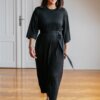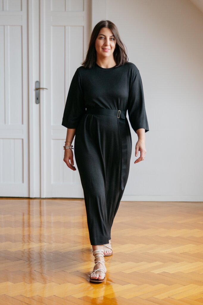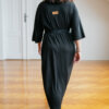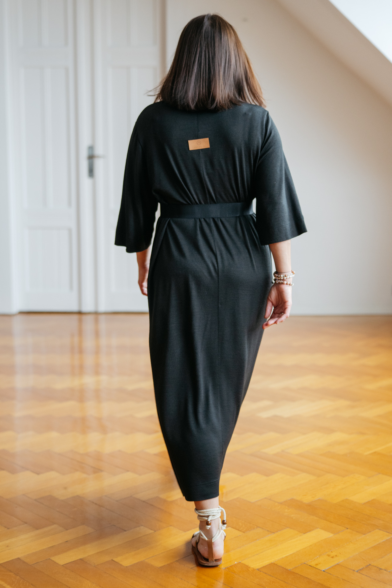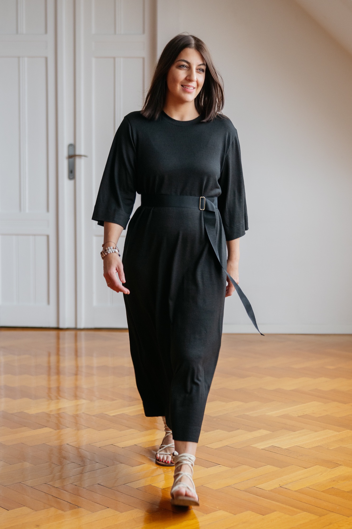 Ez a hosszú, letisztult vonalvezetésű ruha a kényelem és a nőies megjelenés tökéletes egyensúlya. Lágy esésű anyaga finoman követi a test vonalát, miközben szabad mozgást biztosít egész nap.
