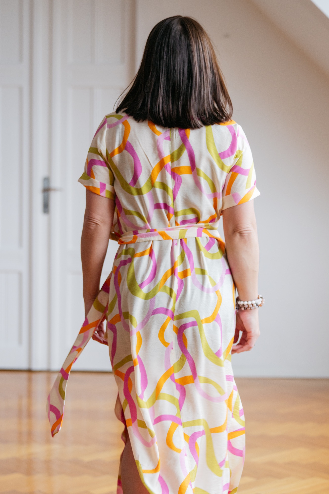 Az oldalsó hasíték mozgás közben finoman megnyílik, nőies és elegáns esést ad a ruhának.