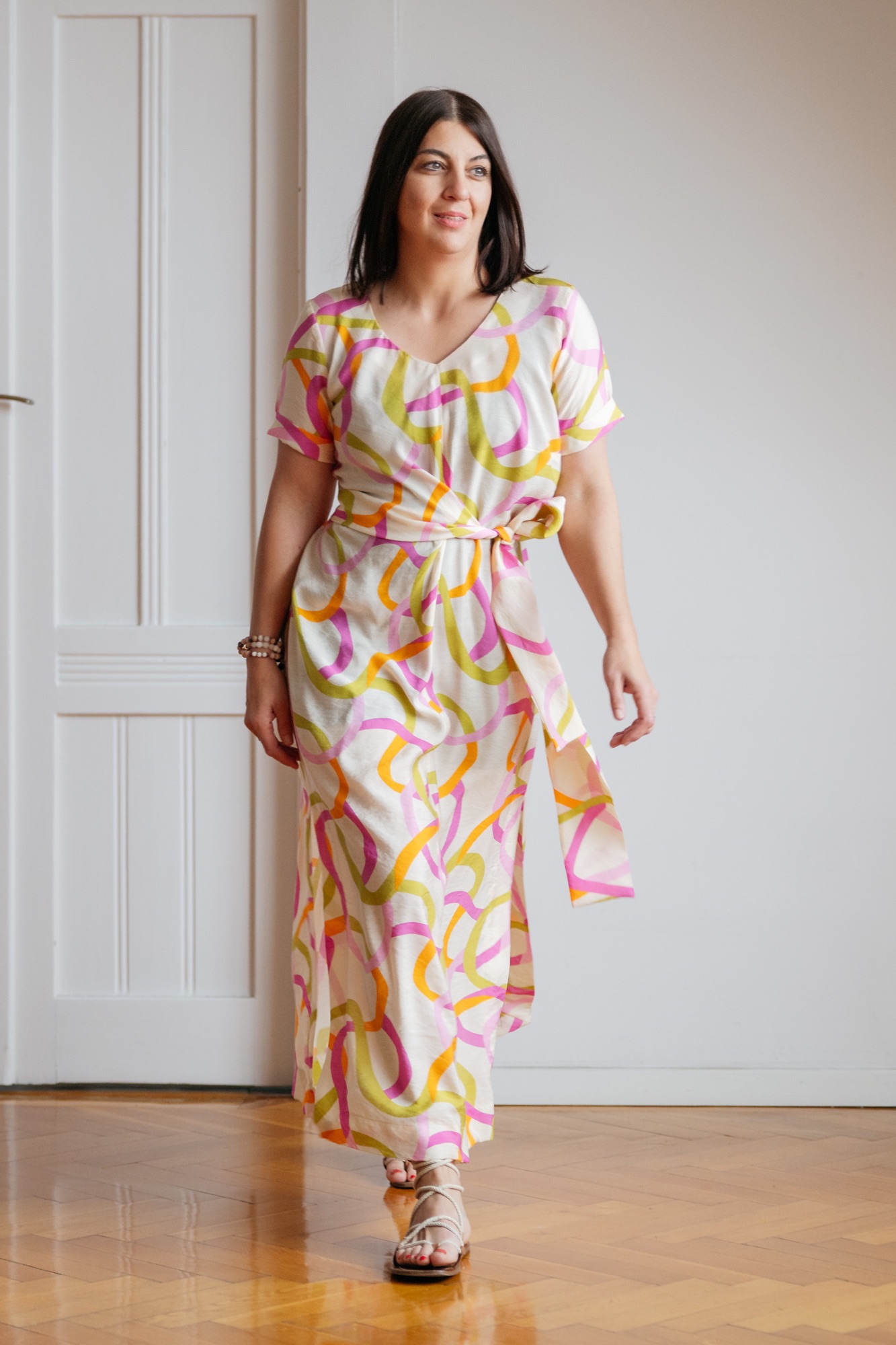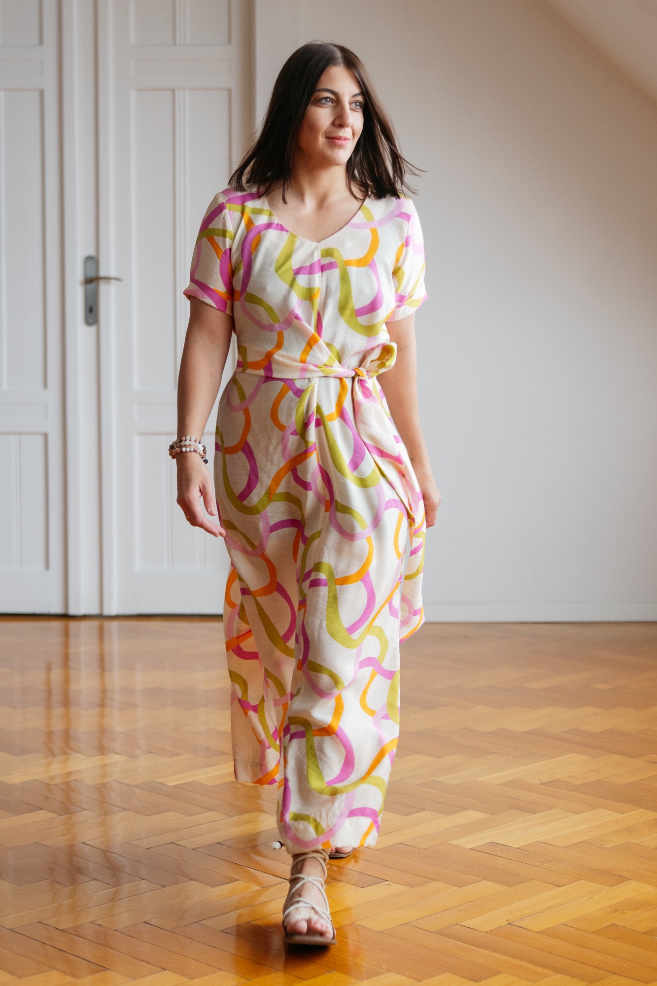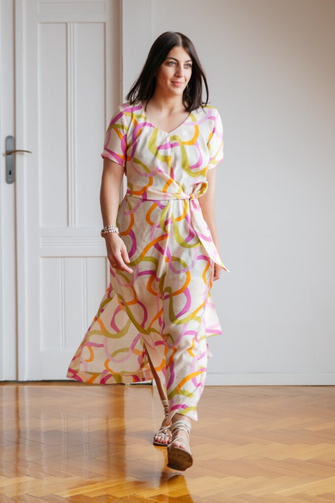 Ez a V kivágású ruha a lazaság és a nőies elegancia tökéletes egyensúlya – hétköznapra és alkalmi viseletként is.