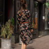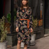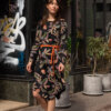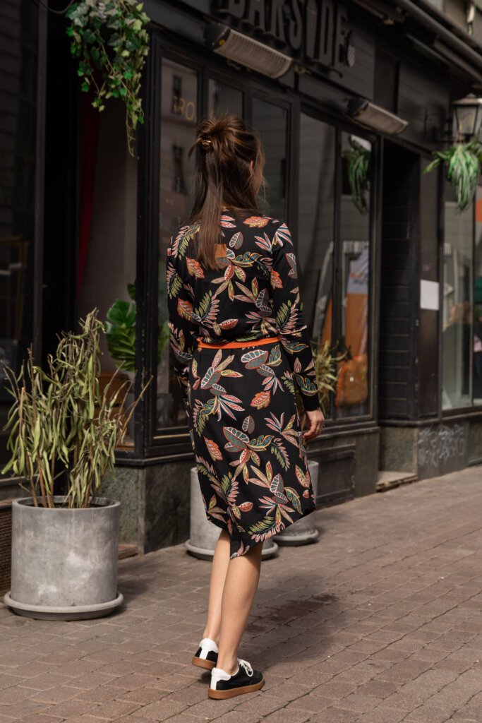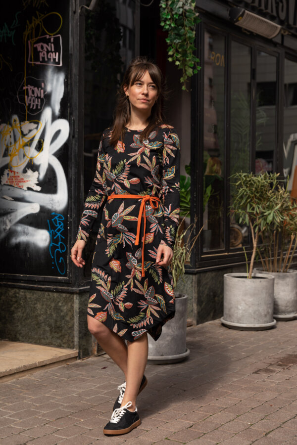 Ez a ruha azoknak készült, akik szeretik a könnyen viselhető darabokat. A fekete alapot meleg, természet ihlette minták törik meg, amitől igazán különleges lesz.